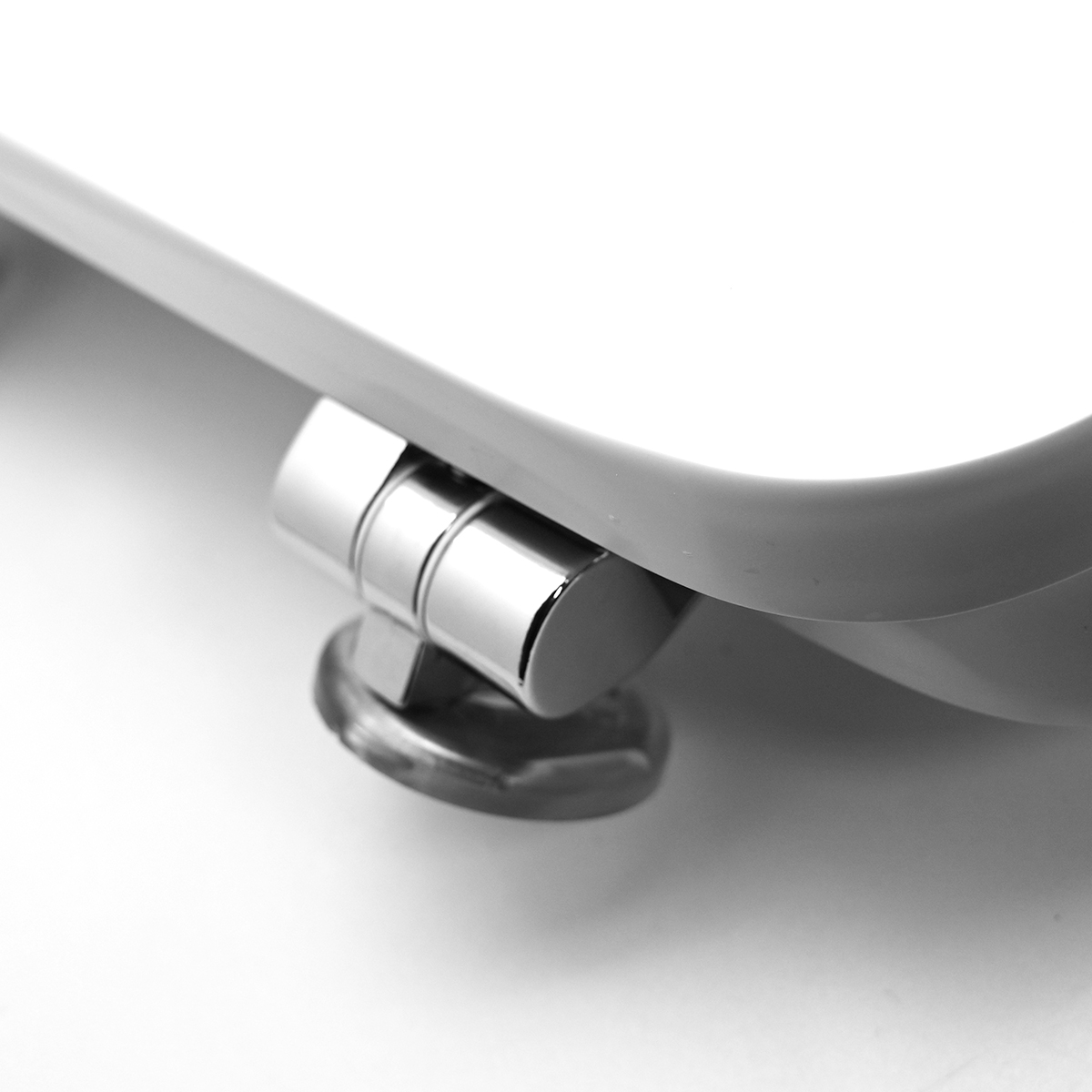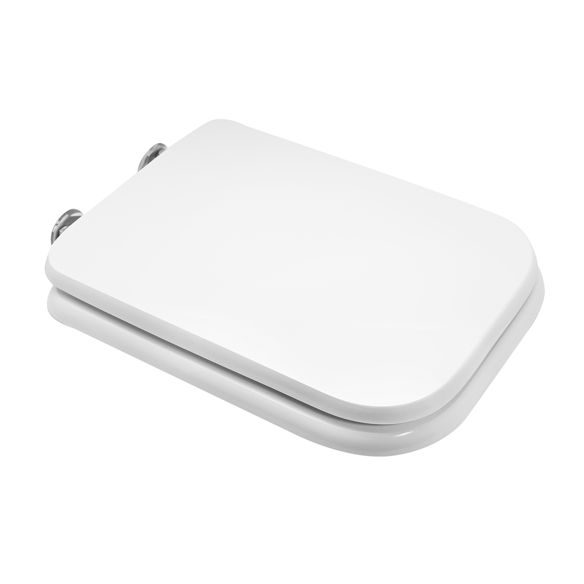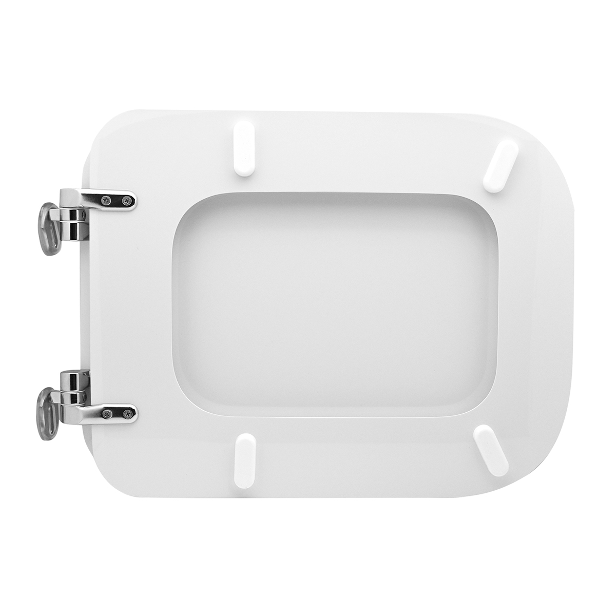 Sedile (Forma tipo 8) dedicato a casa ceramica Hatria-Spea serie Bianca. Dimensioni: Lunghezza cm 42-46; Larghezza cm 34; Interasse cerniere cm 11-21; Cerniere regolabili soft closing. Sedile in legno stabilizzato, colato in poliestere. Cerniere in ottone cromato e viti di fissaggio in acciaio inox.