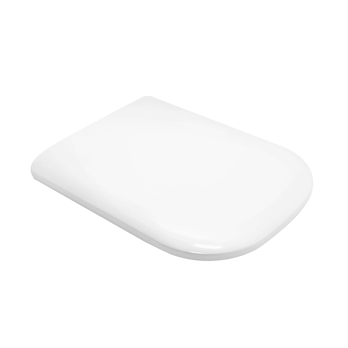 Sedile WC in termoindurente (Forma tipo 7), formato slim coprente, per vaso serie Primula sospeso e filo muro. Dimensioni: Lunghezza 43 cm; Larghezza 36 cm; Interasse cerniere 5,5-21 cm. Cerniere Soft closing regolabili, a sgancio rapido, tipo C ad espansione, avvitabili dall'alto.
