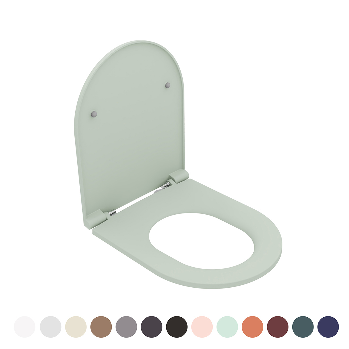Sedile in termoindurente (Forma tipo 7 - Cerniere universali) dedicato a casa ceramica Nymo serie Infinity. Dimensioni: Larghezza 36,5 cm; Lunghezza 40-44,5 cm; interasse 14-23,5 cm. Cerniere universali in acciaio inox. Soft closing. Per vaso filo muro Y182-NF450 e sospeso Y182-NF411.