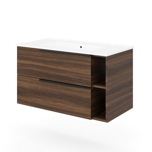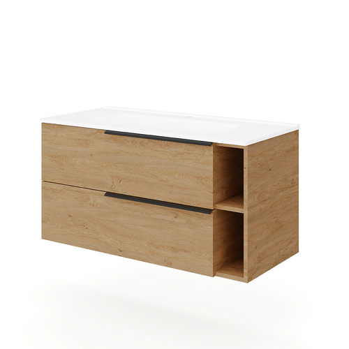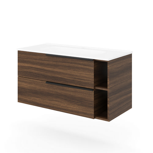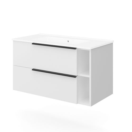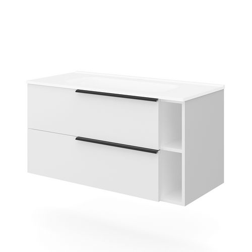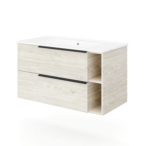 Base sospesa a due cassetti e due vani a giorno con sponde in metallo e chiusura rallentata; maniglie in metallo grigio antracite. Lavabo in ceramica. In truciolare nobilitato effetto legno. La variante bianco lucido ha i frontali dei cassetti in MDF. Certificazione FSC.
