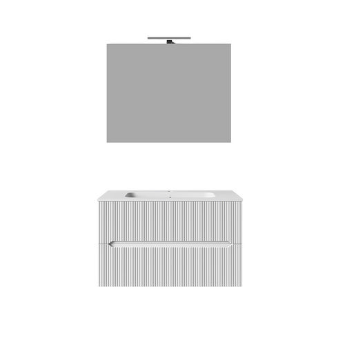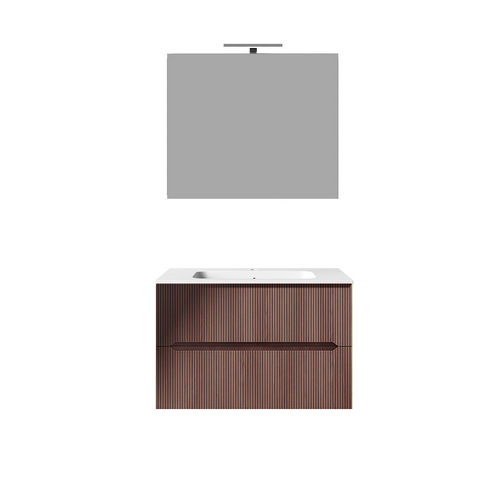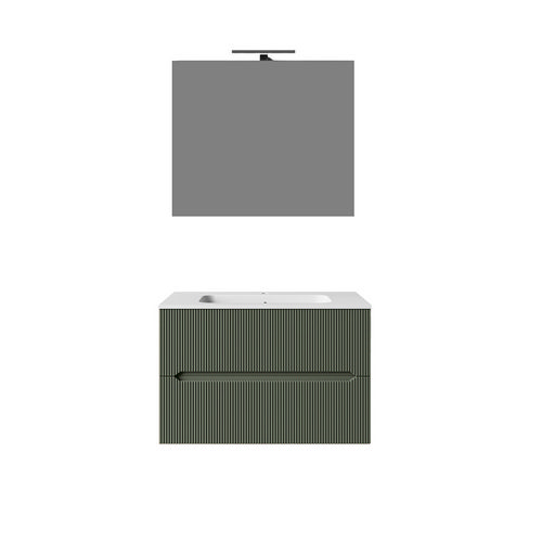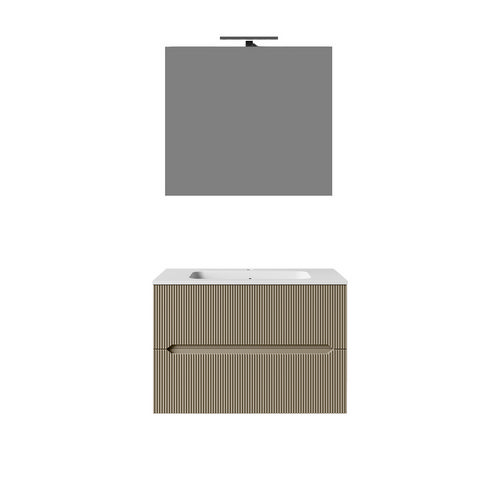 Base portalavabo Stick Cannettato 2 cassetti L.70 H.45 P.46 cm. Lavabo ceramica L.70 H.1,3 P.46 cm . Specchiera filo lucido L.70 H.75 P. 2,5 cm. Lampada a led. La base è realizzata esternamente in mdf rivestito in polimerico, i cassetti hanno la caratteristica maniglia a gola e il sistema soft-closing. Cassetto superiore con vano sifone.
