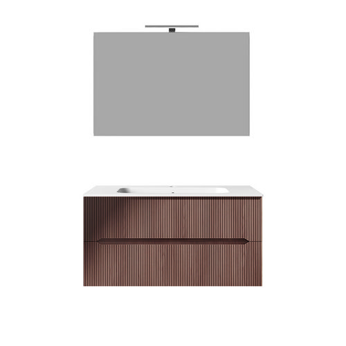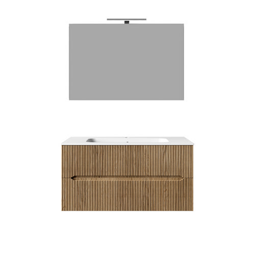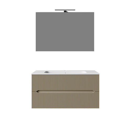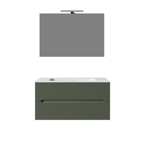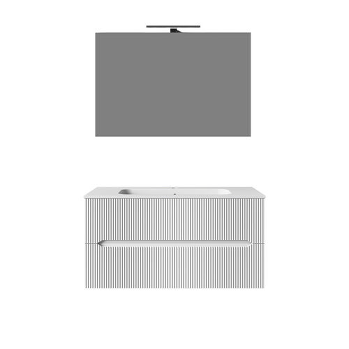 Base portalavabo Stick cannettato 2 cassetti L.90 H.45 P.46 cm. Lavabo ceramica L.90 H.1,3 P.46 cm. Specchiera filo lucido L.90 H.60 P.2,5 cm. Lampada a led. La base è realizzata esternamente in mdf rivestito in polimerico, i cassetti hanno la caratteristica maniglia a gola e il sistema soft-closing. Cassetto superiore con vano sifone.