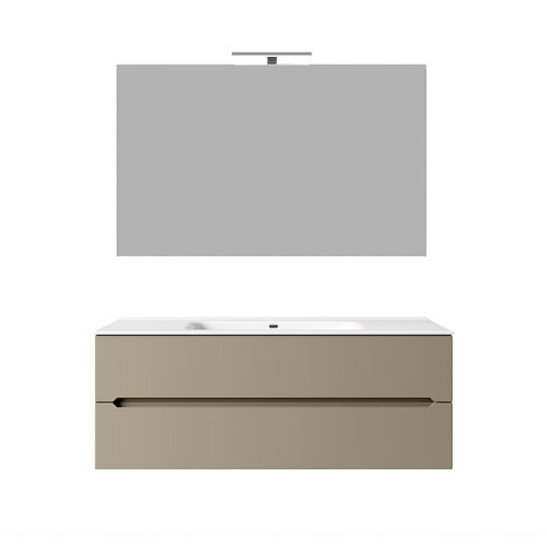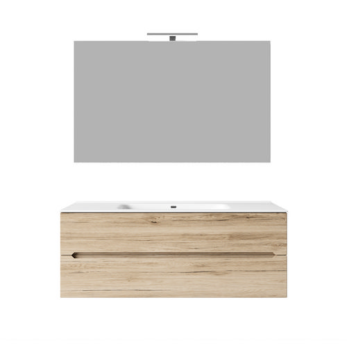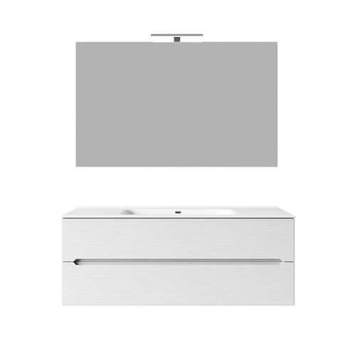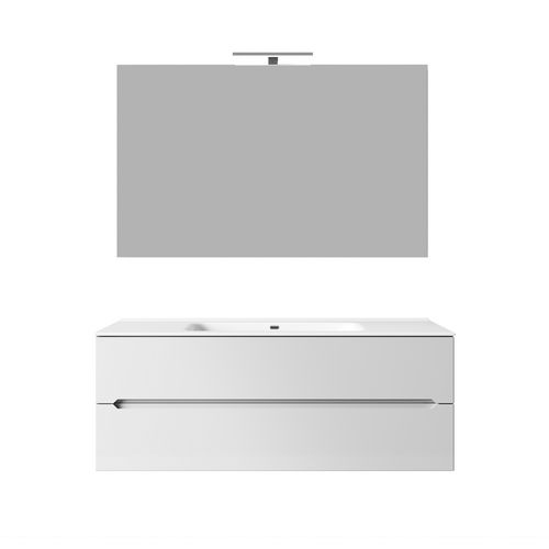 Il set è composto da base 2 cassetti LxHxP cm 120x45x46, lavabo integrale in ceramica, specchio a filo lucido LxH cm 120x75 e lampada led. La base è realizzata esternamente in mdf rivestito in polimerico, i cassetti hanno la caratteristica maniglia a gola e il sistema soft-closing. Cassetto superiore con vano sifone.