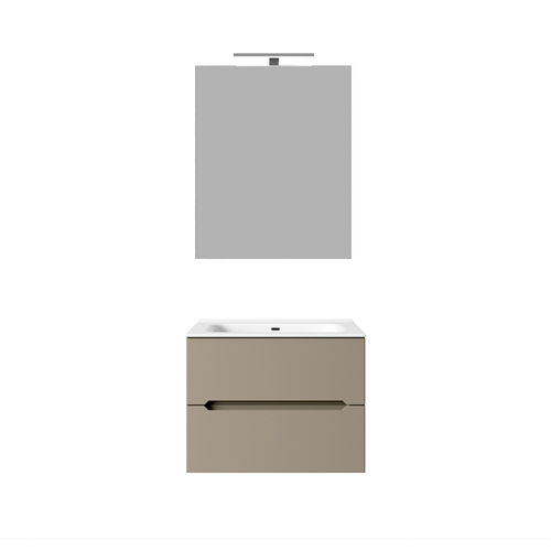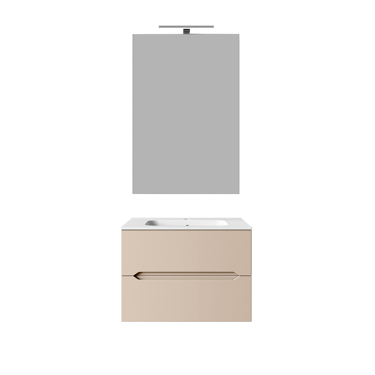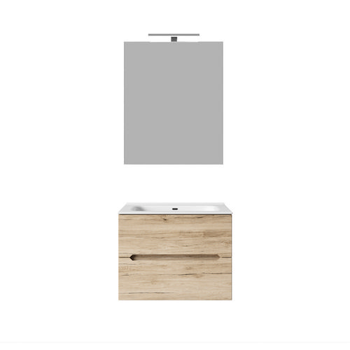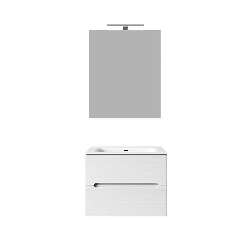 Il set è composto da base 2 cassetti LxHxP cm 60x45x46, lavabo integrale in ceramica, specchio a filo lucido LxH cm 60x75 e lampada led. La base è realizzata esternamente in mdf rivestito in polimerico, i cassetti hanno la caratteristica maniglia a gola e il sistema soft-closing. Cassetto superiore con vano sifone.