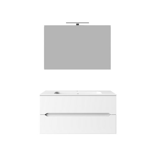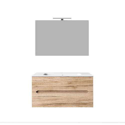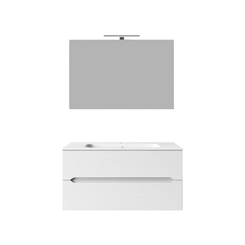 Il set è composto da base 2 cassetti LxHxP cm 91x47x46, lavabo integrale in ceramica, specchio a filo lucido LxH cm 90x60 e lampada led. La base è realizzata esternamente in mdf rivestito in polimerico, i cassetti hanno la caratteristica maniglia a gola e il sistema soft-closing. Cassetto superiore con vano sifone.