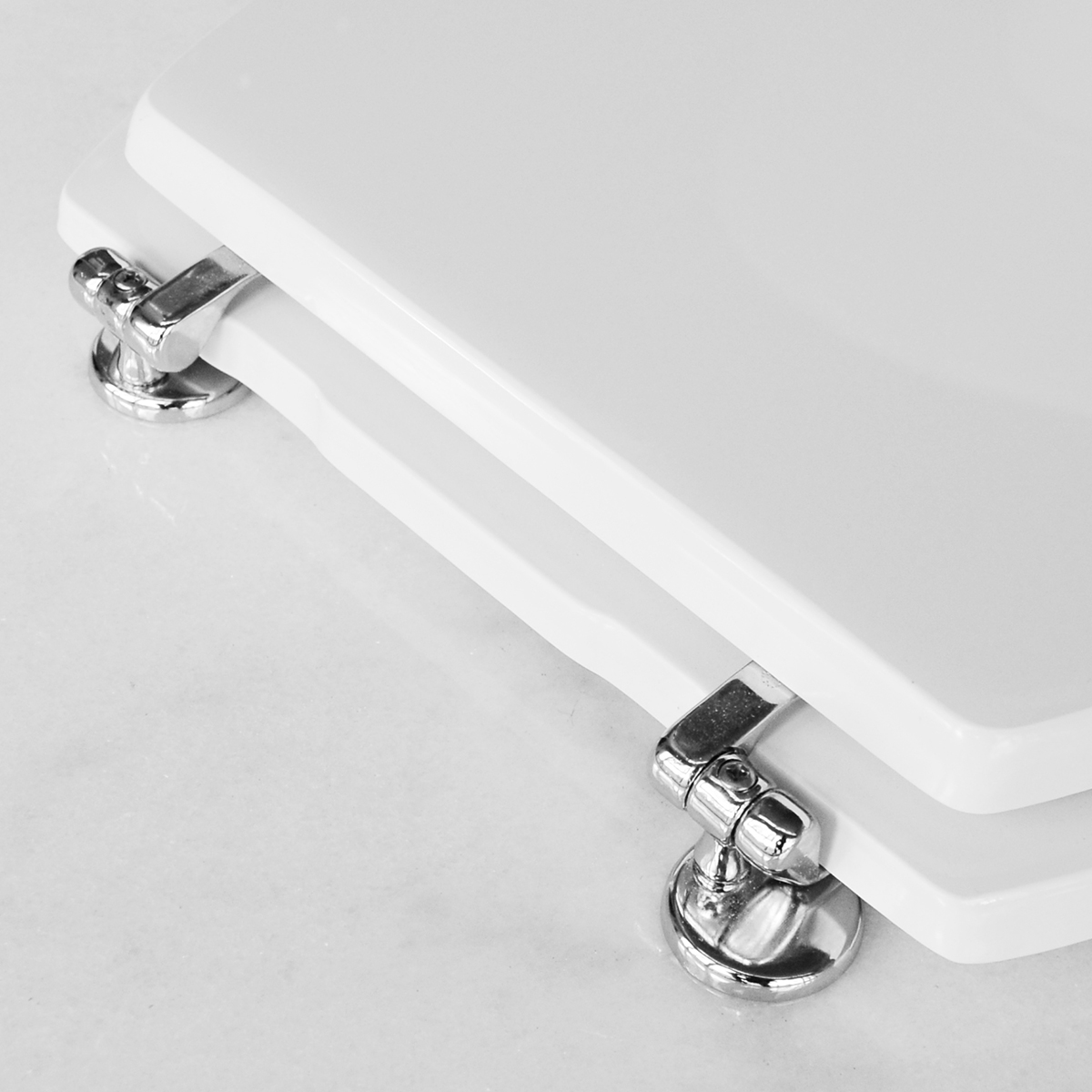 Sedile (Forma tipo 10 - cerniere tipo A) dedicato a casa ceramica Ceramica Vitruvit serie Old Time. Dimensioni: Lunghezza cm 41,5-46,5; Larghezza cm 37,5; Interasse cerniere cm 14-24,5 mod. con cerniere regolabili. Sedile in legno stabilizzato lavorato, colato in poliestere. Cerniere in ottone cromato e viti di fissaggio in acciaio inox.