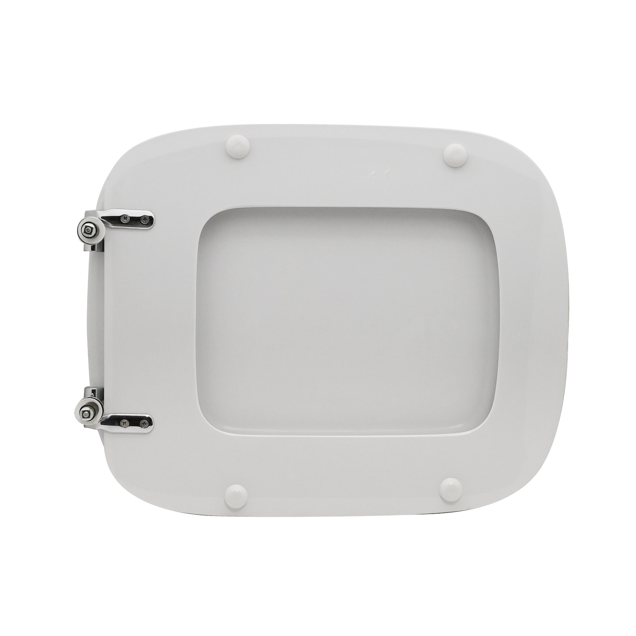 Sedile (Forma tipo 8 - cerniere tipo C) dedicato a casa ceramica Dolomite serie Rio. Dimensioni: Lunghezza cm 43,5; Larghezza cm 36; Interasse cerniere cm 16. mod. con cerniere fisse. Sedile in legno stabilizzato, colato in poliestere. Cerniere in ottone cromato e viti di fissaggio in acciaio inox.